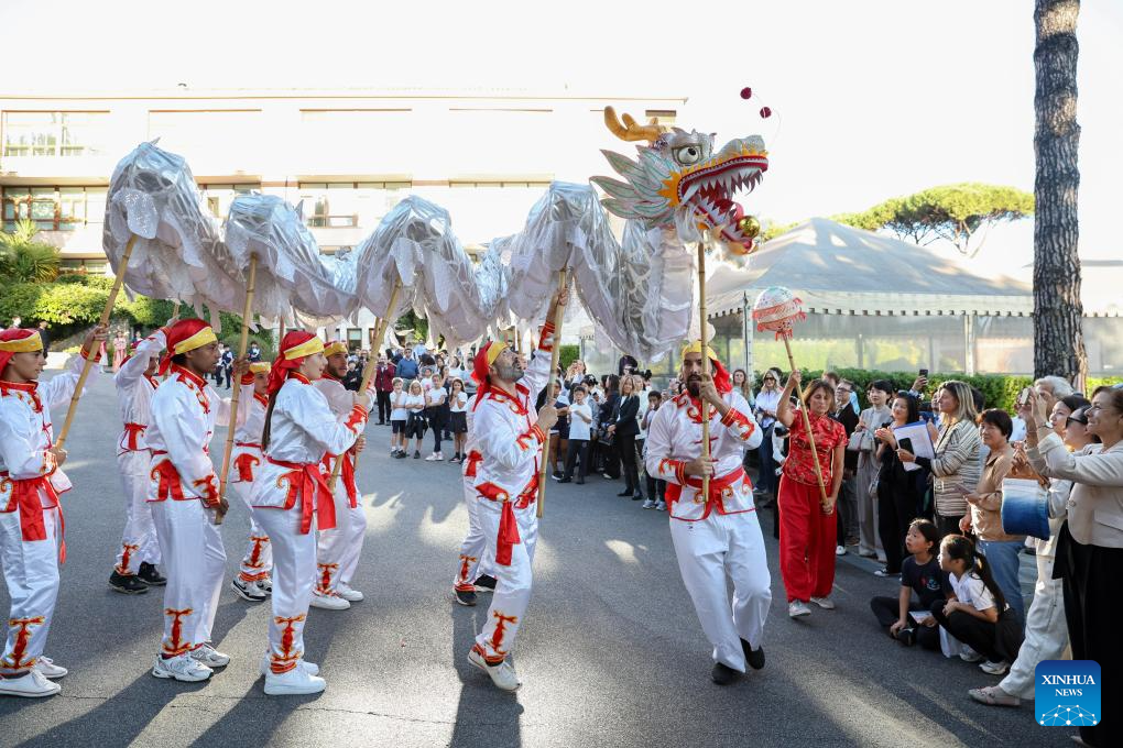 Local Chinese culture enthusiasts perform dragon dance during a Mid-Autumn-themed funfair at Marymount International School in Rome, Italy, on Oct. 10, 2025. The funfair was held here on Friday, where students and local residents enjoyed a variety of Chinese cultural activities and performances presented by local enthusiasts of Chinese culture. (Xinhua/Li Jing)