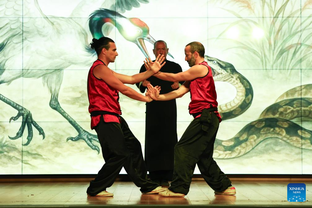 Local Chinese culture enthusiasts perform Chinese Kung Fu during a Mid-Autumn-themed funfair at Marymount International School in Rome, Italy, on Oct. 10, 2025. The funfair was held here on Friday, where students and local residents enjoyed a variety of Chinese cultural activities and performances presented by local enthusiasts of Chinese culture. (Xinhua/Li Jing)